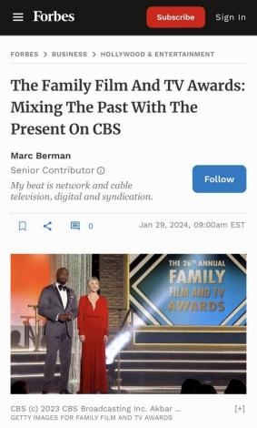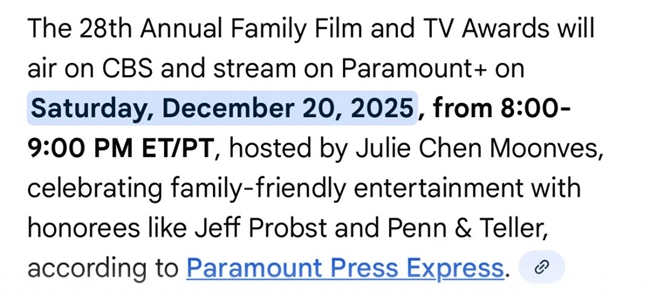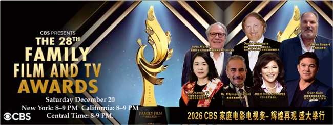 重磅新闻:CBS《家庭电影与电视奖》(Family Film & TV Awards),将在 12月20日(周六)晚 8–9 点 全美同步播出:纽约时间 8–9 PM;加州时间 8–9 PM;中部时间 8–9 PM。
